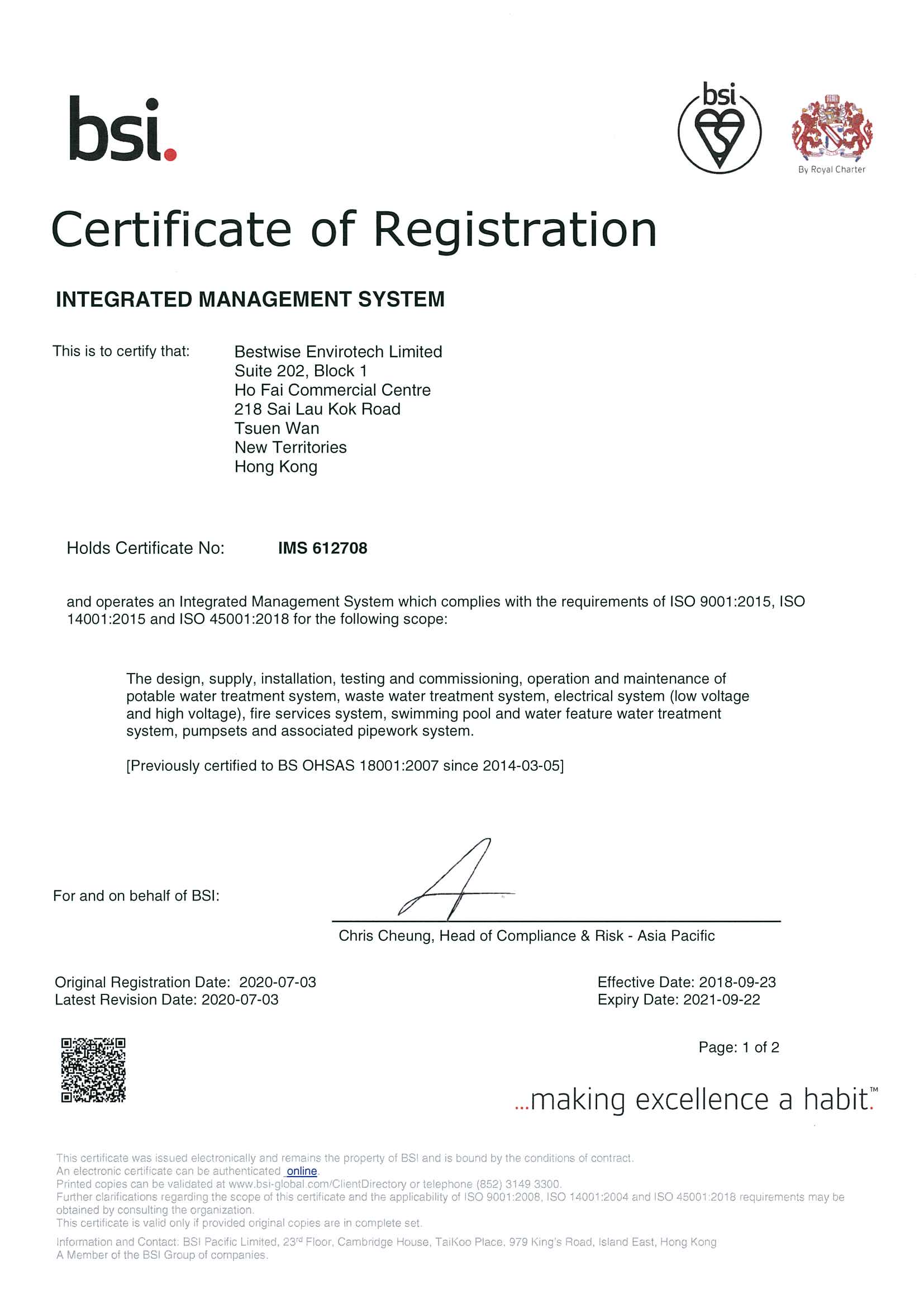 Being accredited to Integrated Management System comprising: ISO 9001:2015 Quality Management SystemISO 14001:2015 Environmental Management SystemISO 45001:2018 Occupational Health & Safety Management System Bestwise is committed to serve our customers in compliance with the relevant codes of practice related to quality, environmental protection, safety and health. This commitment is applicable to all Bestwise's operations for projects of any size and scope.